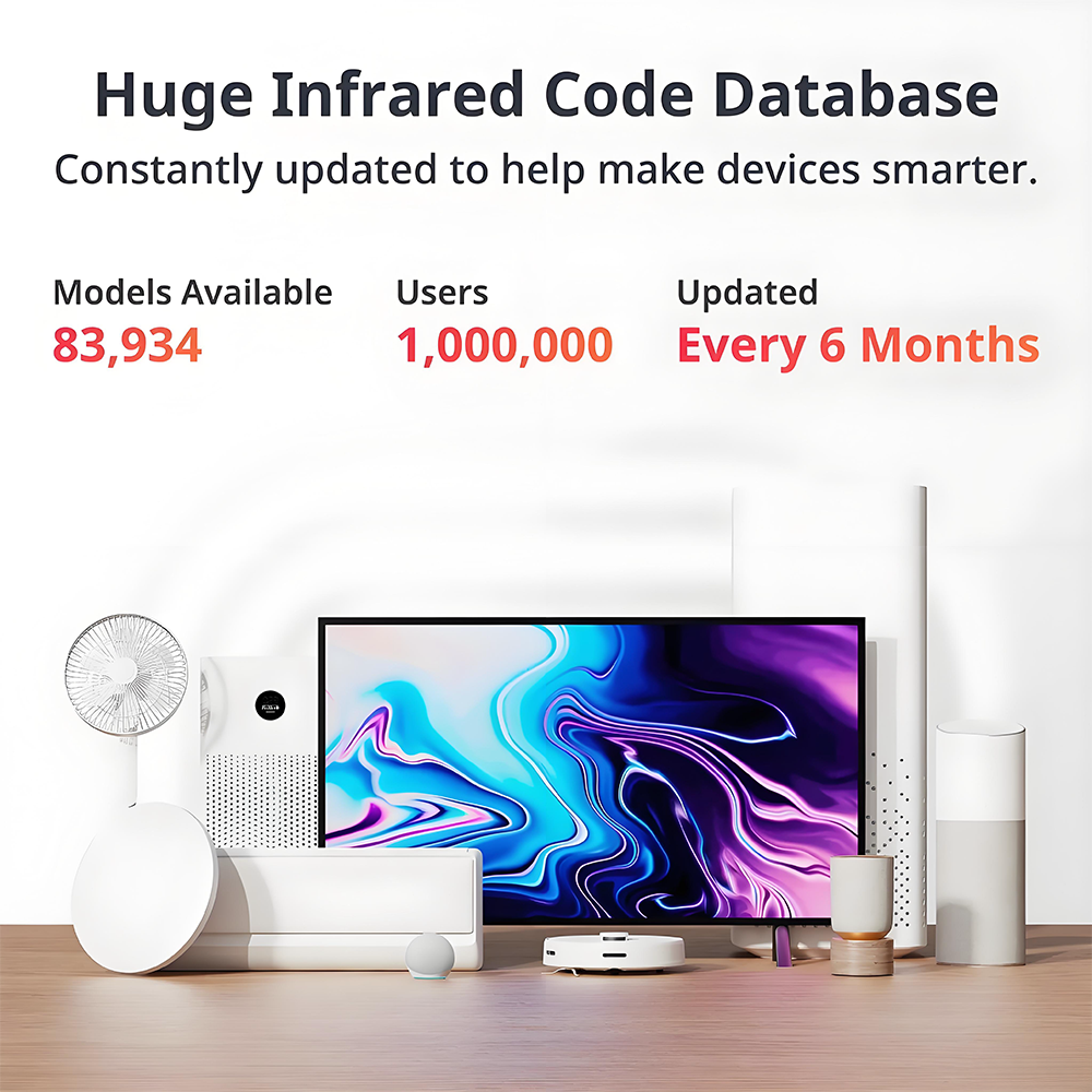 š„Rapid Setup: Add appliances in 10 minutes with access to a vast library of 83,934 supported remote control models, facilitating pairing via the app.