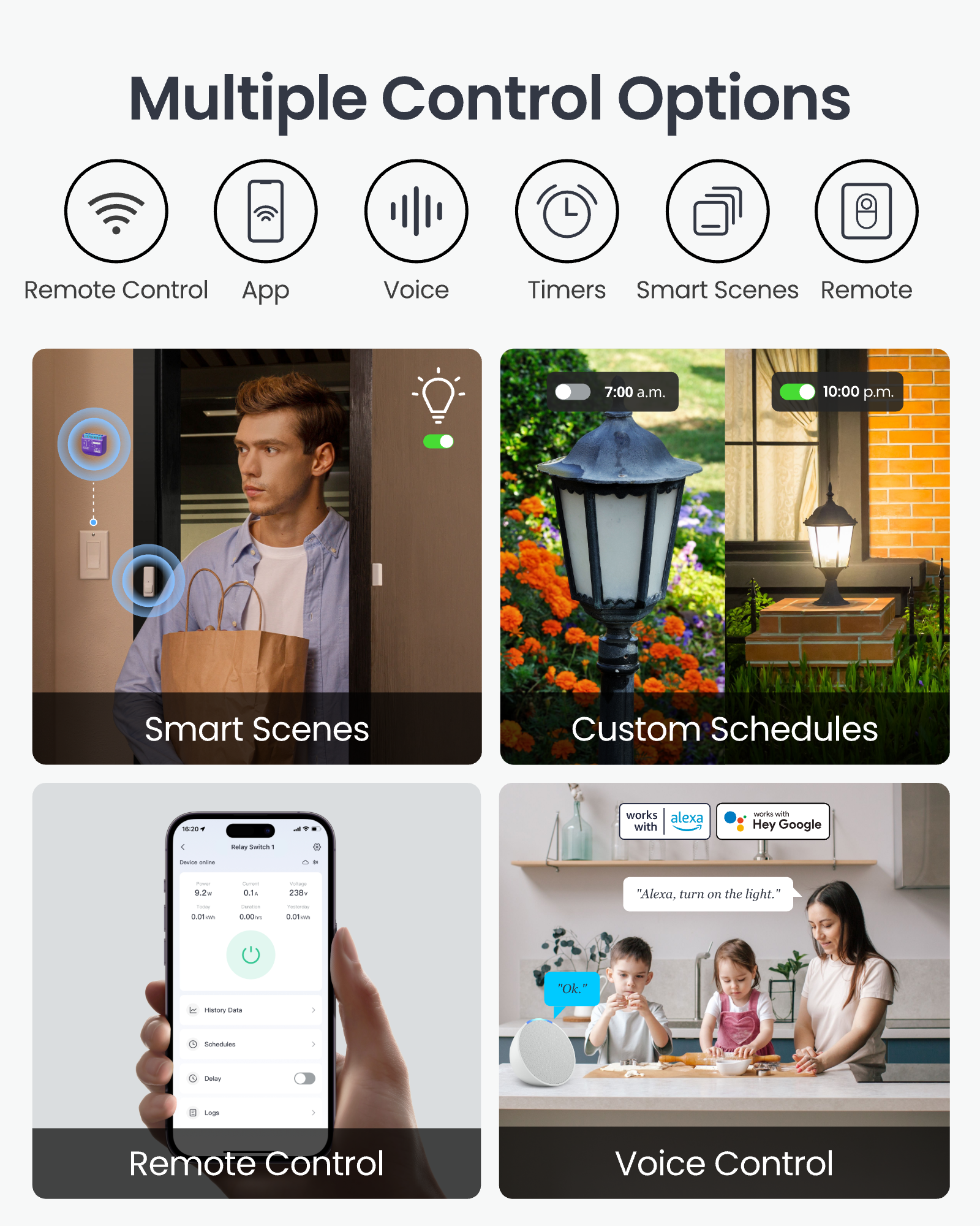 Easily upgrade your existing appliances like lights, garage doors, and locks to smart devices. Quick 10-minute installation without rewiring or replacing switches__ust control them via your phone or automation.